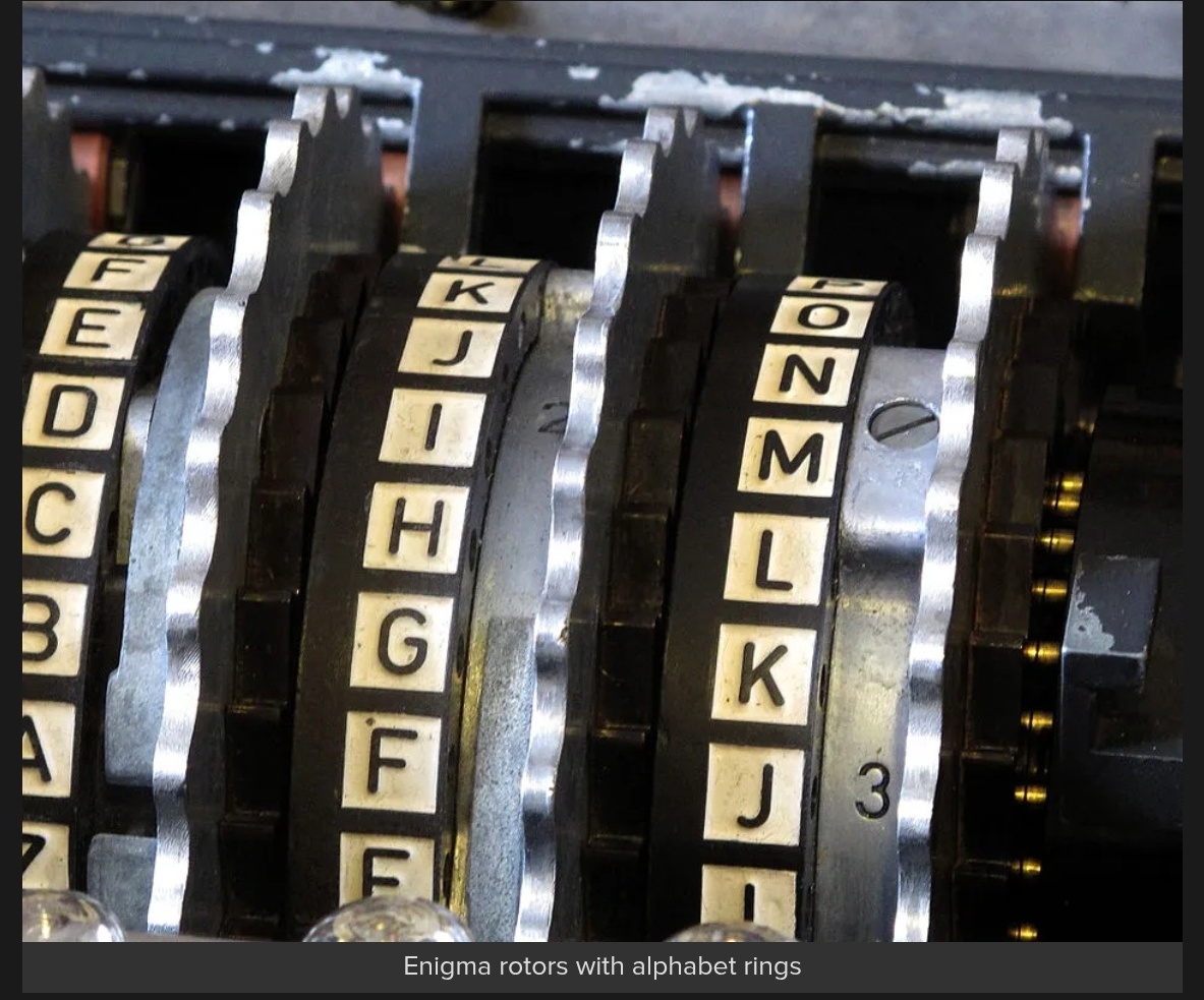ENIGMA var från början en tysk, helt civil kryapp avsedd för industri, bolag, statlig och privat kommunikation. Tyska Wehrmacht anskaffade denna och modifierade den för militära behov. Bl.a. skaffades en version med fyra (inte tre) motorhjul för större säkerhet, till marinen. Det var polackerna som knäckte systemet, och som sedermera överlämnade underlaget till England (Bletchley Park), där arbetet fortsatte under ledning av kryptoexperten Alan Turing.
